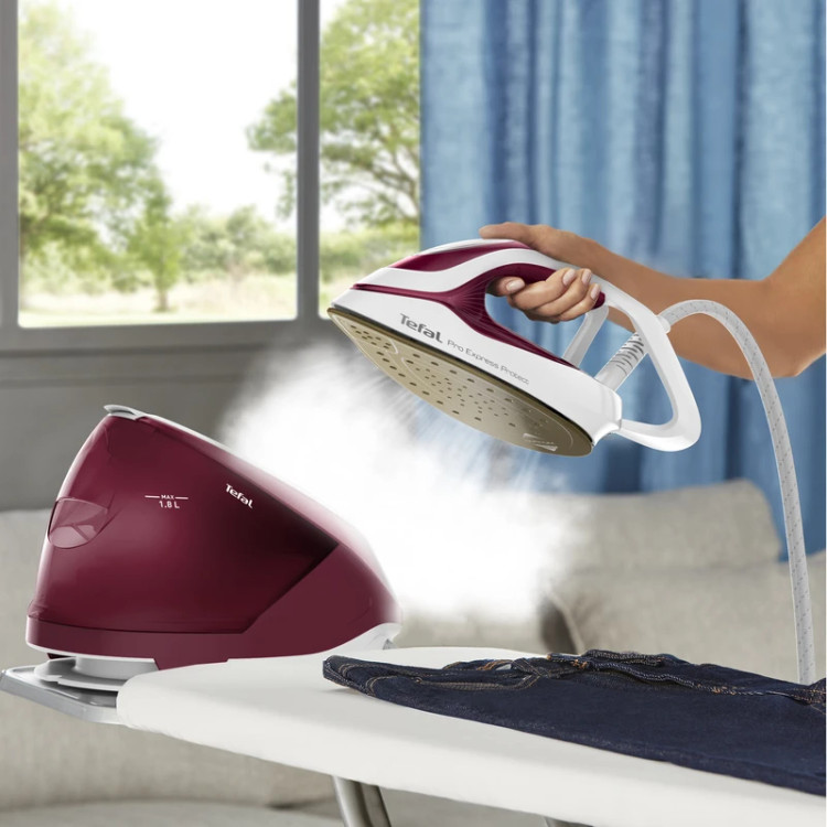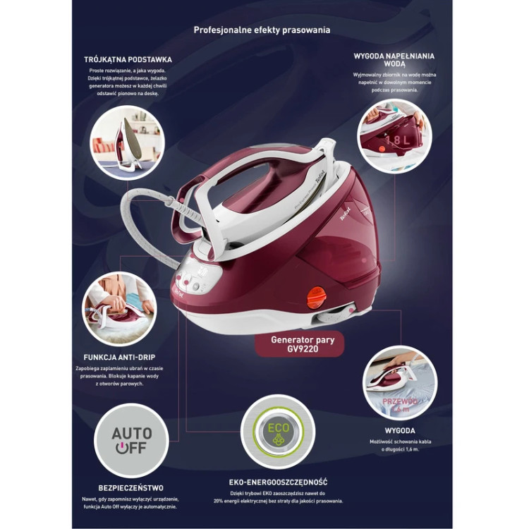 اتو مخزندار تفال مدل GV9220 با طراحی مدرن و ترکیب رنگ شرابی و سفید جلوهای خاص و حرفهای دارد.