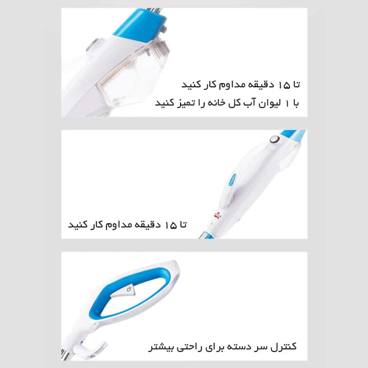 برای تمیز کردن سطوحی مانند سرامیک و سنگ تنها کافی است مخزن را از آب پر کرده و دستگاه را روشن کنید. سری بخارشوی دارای دو پد مخصوص قابل شستشو است که پس از هر بار استفاده بهراحتی جدا شده و تمیز میشوند.