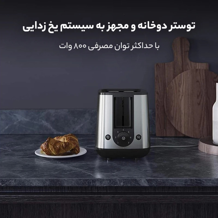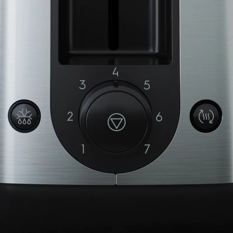 بر روی بدنه دستگاه یک ولوم چرخشی با 7 سطح تنظیم برشتگی تعبیه شده است که به شما این امکان را میدهد میزان برشته شدن نان را دقیقاً مطابق سلیقه خود انتخاب کنید. این قابلیت باعث میشود نان نه بسوزد و نه خام بماند، بلکه دقیقاً همان میزان تردی و طلایی شدن دلخواه شما را داشته باشد. همچنین این توستر مجهز به عملکردهای یخزدایی، گرم کردن مجدد و توقف عملیات است؛ بنابراین میتوانید نانهای فریزری را مستقیماً داخل دستگاه قرار دهید یا نان سرد شده را بدون خشک شدن دوباره گرم کنید.