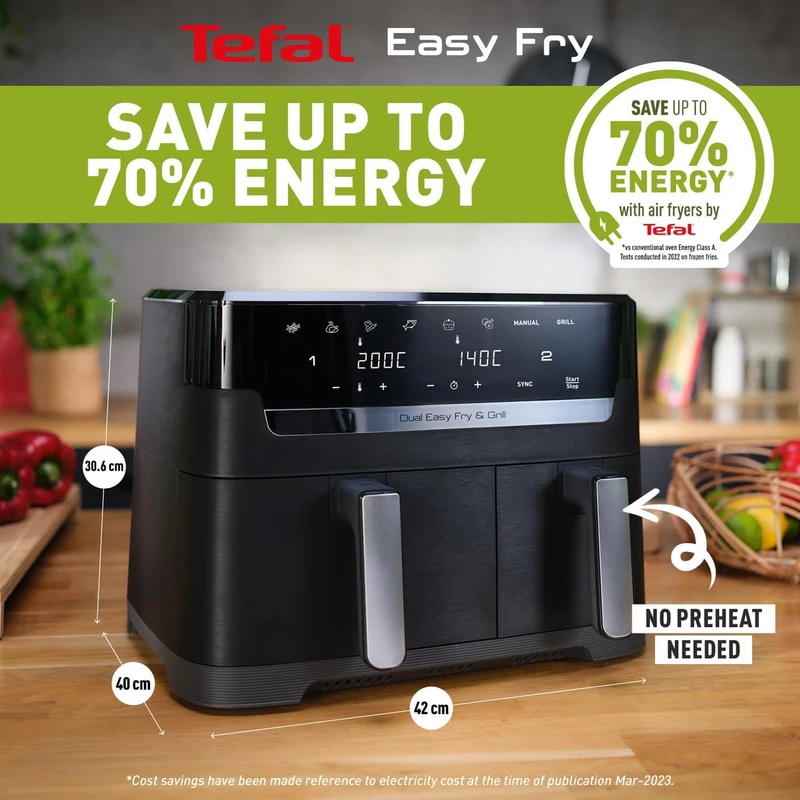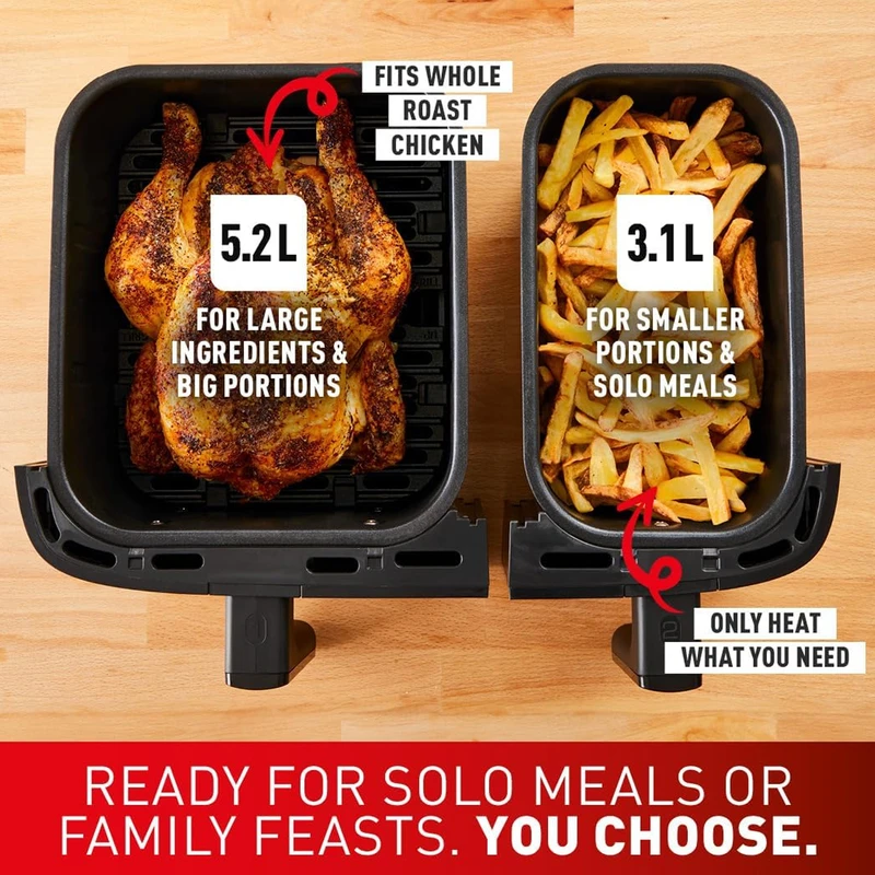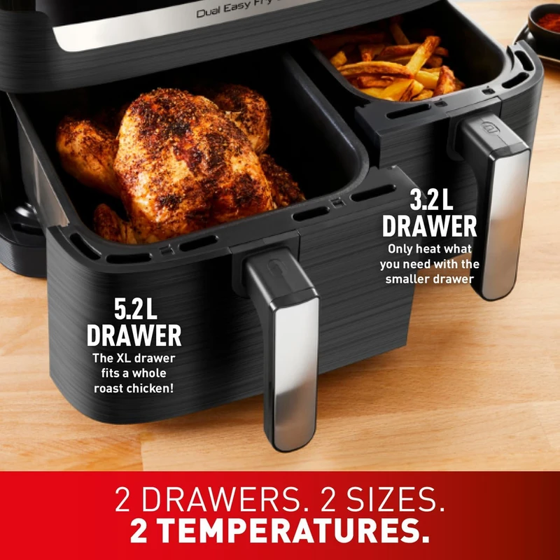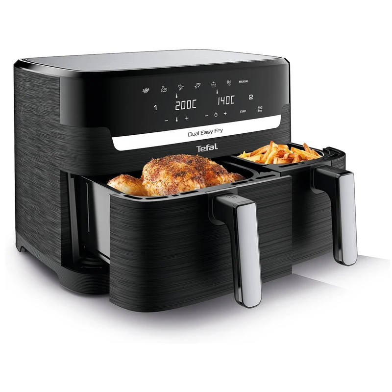 سرخکن دوقلو تفال EY901840 با ظرفیت کلی 8.3 لیتر و برخورداری از دو محفظه پخت مجزا، امکان تهیه همزمان دو غذای متفاوت را فراهم میکند. این ویژگی به شما اجازه میدهد بدون تداخل طعم و زمان، وعدههای غذایی متنوعتری را در یک نوبت آماده کنید.