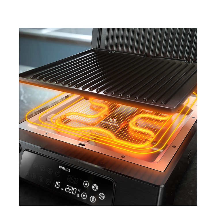 صفحات بزرگ و قابل تنظیم: دستگاه دارای دو صفحه گریل بزرگ است که صفحه بالایی در ۵ زاویه مختلف قابل تنظیم بوده و تا ۱۸۰ درجه به طور کامل باز میشود. این قابلیت امکان پخت مواد غذایی با ضخامتهای مختلف (مانند پیتزا یا ساندویچ) و همچنین استفاده به صورت باربیکیو رومیزی را فراهم میکند.