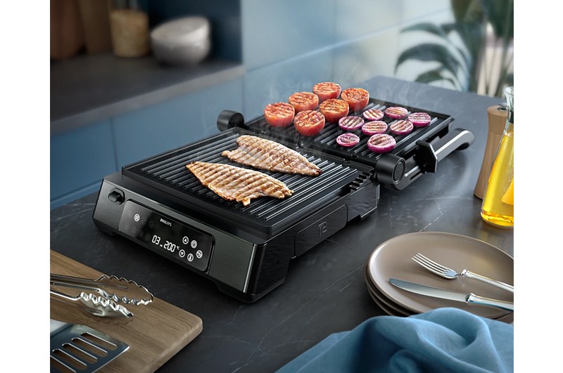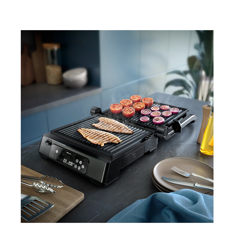صفحات بزرگ و قابل تنظیم: دستگاه دارای دو صفحه گریل بزرگ است که صفحه بالایی در ۵ زاویه مختلف قابل تنظیم بوده و تا ۱۸۰ درجه به طور کامل باز میشود. این قابلیت امکان پخت مواد غذایی با ضخامتهای مختلف (مانند پیتزا یا ساندویچ) و همچنین استفاده به صورت باربیکیو رومیزی را فراهم میکند.