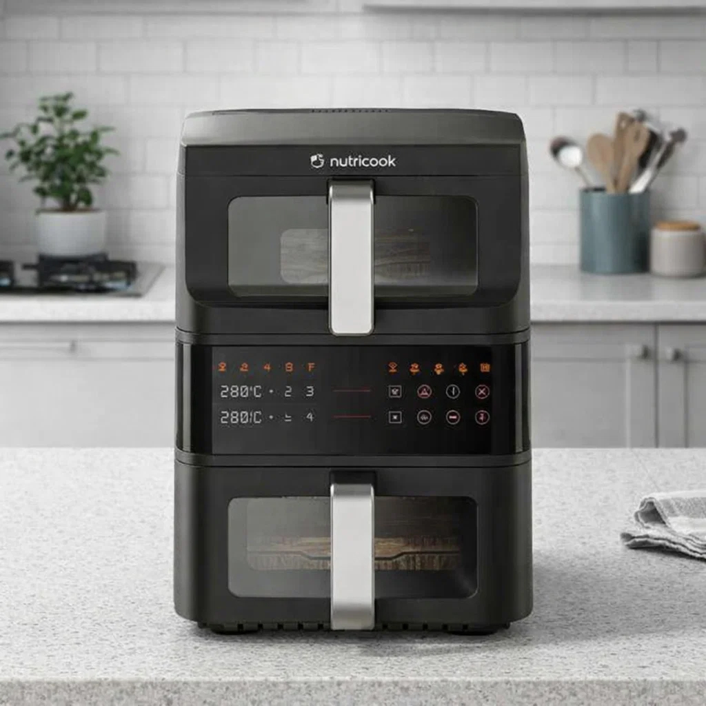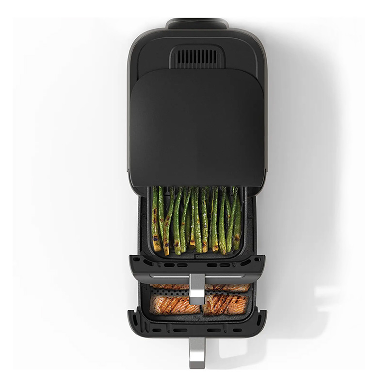 این طراحی به شما امکان میدهد تا به طور همزمان دو غذای کاملاً مختلف (مانند سیبزمینی سرخکرده در یک محفظه و مرغ گریل شده در محفظه دیگر) را با تنظیمات دمایی و زمانی جداگانه آماده کنید. ظرفیت کلی ۱۰ لیتری آن برای سرویسدهی به ۷ تا ۹ نفر مناسب است.
