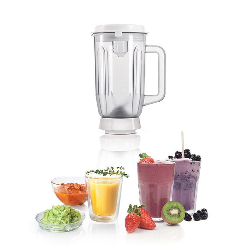 ماشین آشپزخانه بوش مدل MUM4 MUM4409 به یک پارچ مخلوطکن با ظرفیت 1 لیتر مجهز شده است که از جنس پلاستیک مقاوم ساخته شده و برای تهیه انواع نوشیدنیها، اسموتیها و سسها کاربرد فراوانی دارد.